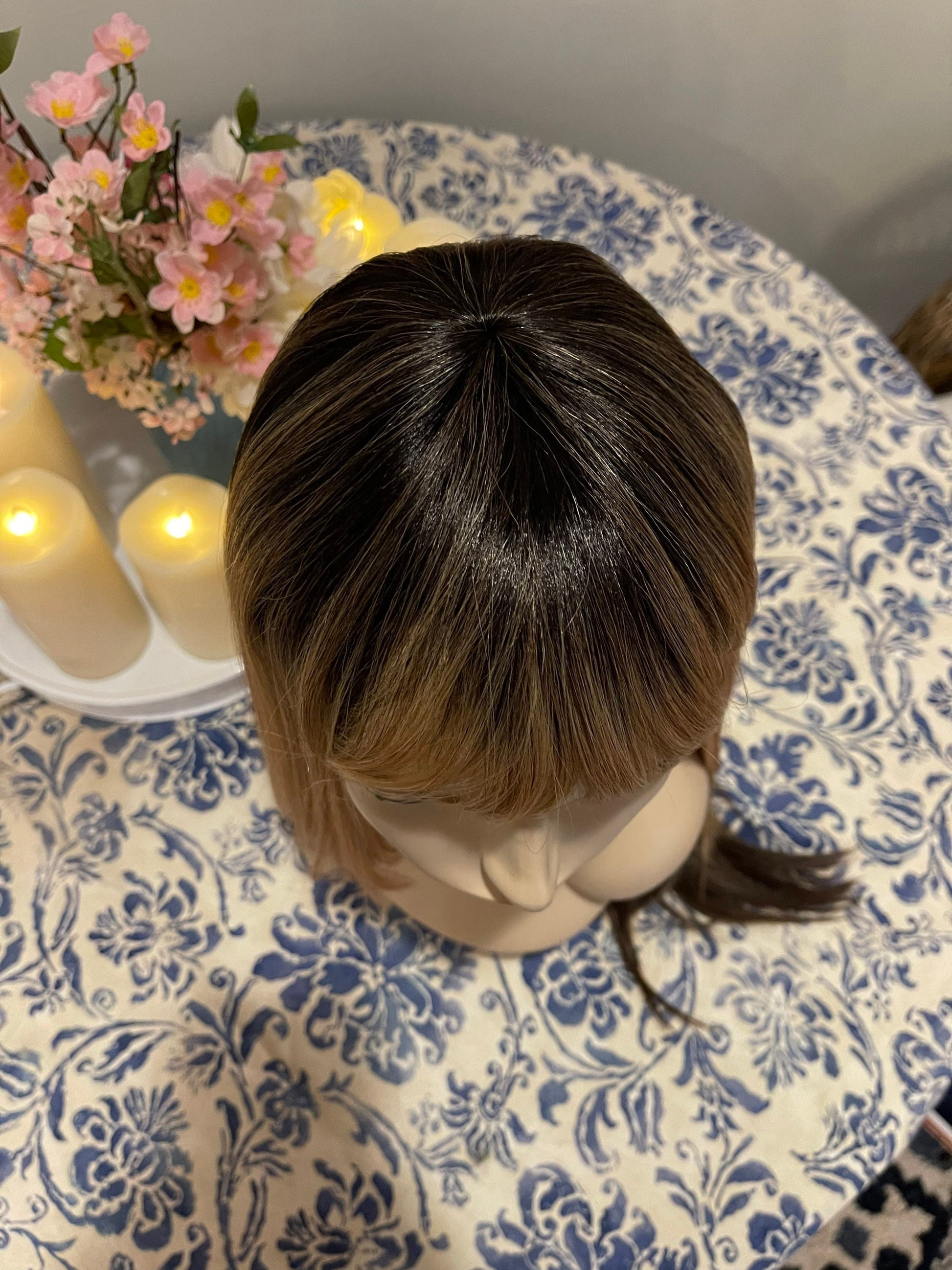 Pull her out of the box and slip her on with no fussing! No lace to worry about, a fully styleable bang, ready to wear or have us trim or thin them for you!