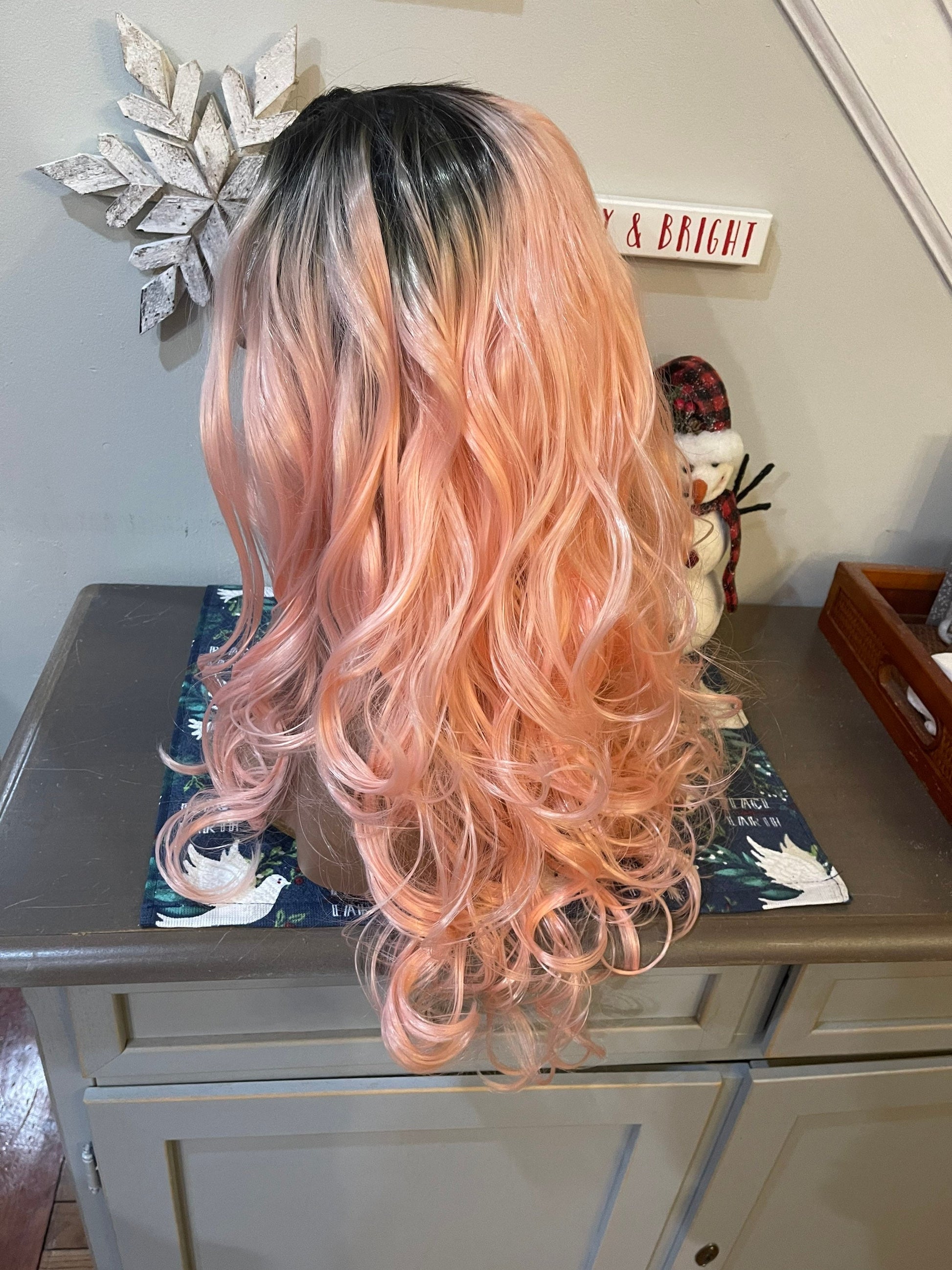She has a slightly warm pink tone color-melted black roots with tons of body from the all over, spiral curls.